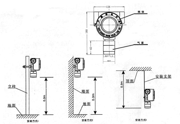 ±äËÍÆ÷°²×°¾àµØÃæ¸ß¶ÈÓ¦´óÓÚ30ÀåÃ×ÒÔ·ÀÓÐË®½¦Èë¡£Ò»°ãÇé¿öÏ£¬¼ì²â±ÈÖØÐ¡ÓÚ¿ÕÆøµÄÓк¦ÆøÌ壬̽ͷӦ°²×°ÓÚ·¿ÎÝ»òÉ豸µÄÉÏ·½£»±ÈÖØ´óÓÚ¿ÕÆøµÄÓк¦ÆøÌ壬̽ͷӦװÓÚÌù½üµØÃæ´¦¡£