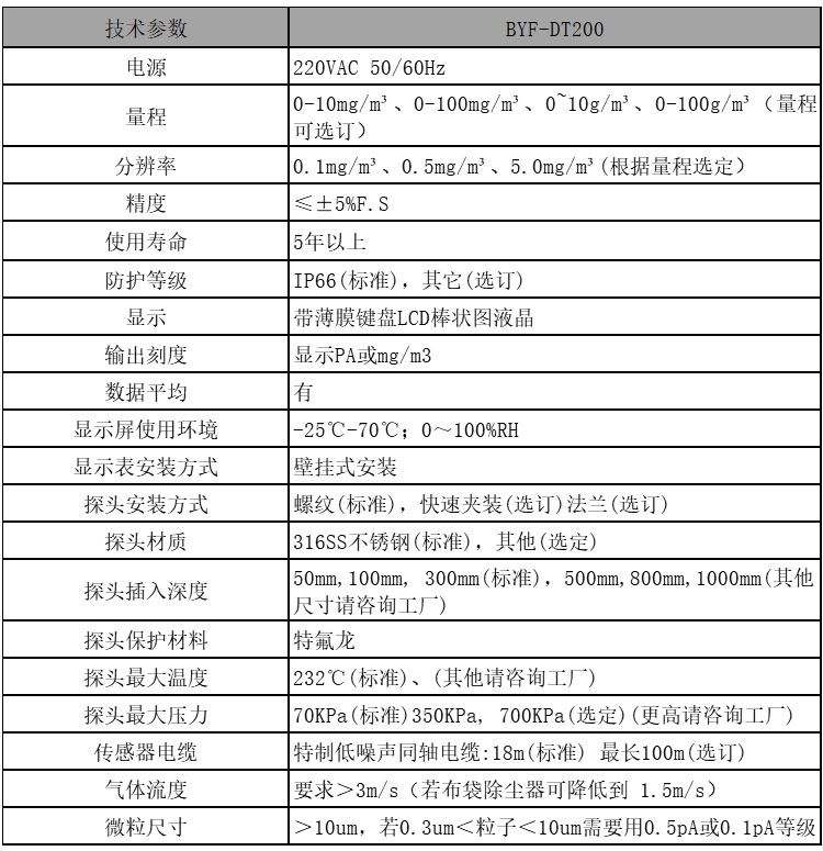 BYF-DT200Ðͽ»Á÷¾²µç·Û³¾Å¨¶ÈÔÚÏß¼ì²âÒÇÊÇÕë¶ÔÈÕǰÉú²ú³µ¼ä¸÷ÖÖ·Û³¾Å¨¶È¼ì²âÑз¢Éú²úµÄÒ»¿îÉ豸£¬¿ÉÒÔ¼òµ¥µÄ£¬ÎÞÐèУ׼²¢ÇÒÂú×㓼´²å¼´ÓԵݲװÔÚÊÕ³¾Æ÷»òÕß²¼´ü³ý³¾Æ÷ÉϹ¤×÷£¬¿É¿¿µÄ´«¸ÐÆ÷̽ͷ°²×°ÔÚ³ý³¾Æ÷ÑÌÆø¹ÜµÀµÄ³ö¿Ú´¦.µ±·Û³¾¿ÅÁ£¾¹ýµÄ̽ͷ¸½½üʱ£¬Ò»¸ö΢ÈõµÄµçºÉÐźű»Ì½Í·¸ÐÓ¦³öÀ´£¬Í¨¹ýÌØÊâµÄͬÖáµçÀ´«Ë͵½¿ØÖƵ¥Ôª.¸ÃÐźž¿ØÖƵ¥Ôª´¦ÀíºóÊä³öÒ»¸öÏßÐÔ±ÈÀýÓÚ΢Á£ÖÊÁ¿º¬Á¿µÄ¾ø¶ÔÊä³öÖµ£¬¾ÍµØÏÔʾ΢Á£º¬Á¿Öµ»ò±¨¾¯²¢ÇÒÌṩ4-20mAÊä³öÖµ.Ö÷ÒªÓÃÓÚÔÚÏß²âÁ¿³µ¼ä×÷Òµ³¡ºÏ·Û³¾Å¨¶Èº¬Á¿£¬²¢³¬±êÔ¤¾¯¡£·ÀÖ¹ÓÉÓÚ·Û³¾Å¨¶È¹ý¸ßÓк¦×÷ÒµÉíÌåÈËÔ±½¡¿µ»òÓÉÓÚŨ¶È¹ý¸ßµ¼Ö±¬Õ¨Ê¹ʣ¬Î£º¦ÉúÃü°²È«¡£